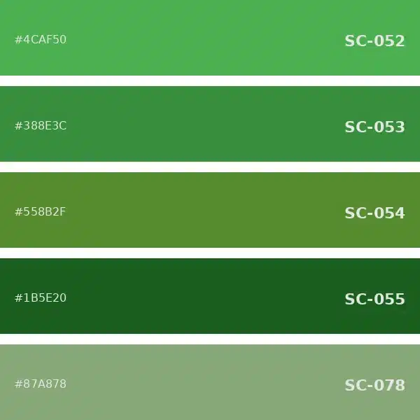 تحتوي الباقة على الألوان: SC-052، SC-053، SC-054، SC-055، SC-078 — كلها من عائلة الألوان أخضر زمردي، مما يوفر تدرجاً لونياً متناسقاً يناسب مختلف أجواء الجلسات.