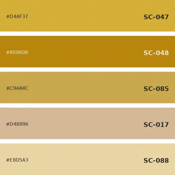 تحتوي الباقة على الألوان: SC-047، SC-048، SC-085، SC-017، SC-088 — كلها من عائلة الألوان ذهبي وعسلي، مما يوفر تدرجاً لونياً متناسقاً يناسب مختلف أجواء الجلسات.