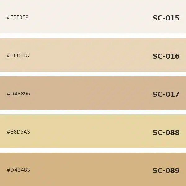 تحتوي الباقة على الألوان: SC-015، SC-016، SC-017، SC-088، SC-089 — كلها من عائلة الألوان كريمي وبيج، مما يوفر تدرجاً لونياً متناسقاً يناسب مختلف أجواء الجلسات.