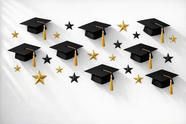 خلفية تخرج بأسلوب الـ flat-lay تُظهر قبعات التخرج السوداء والنجوم الذهبية والسوداء مبعثرة على خلفية بيضاء ناصعة. تصميم عصري أنيق يلتقط روح الإنجاز والتميز. خلفية تخرج مناسبة للتصوير الاحترافي.