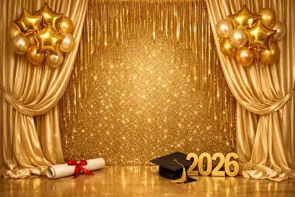 خلفية تخرج 2026 ذهبية رائعة بستارة ذهبية مضيئة بريقاً ساحراً ونجوم وبالونات ذهبية مع قبعة التخرج ورقم 2026 الذهبي. احتفاء مميز بإنجاز العام. توفر هذه الخلفية ألواناً زاهية وتفاصيل دقيقة تظهر بوضوح في الصور. سهولة التنظيف والتخزين تجعلها استثماراً ذكياً لأي استوديو.