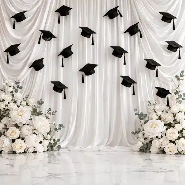 خلفية تخرج أنيقة بستارة ساتان بيضاء ناعمة وقبعات تخرج سوداء متطايرة في الهواء مع باقات ورد بيضاء ضخمة في الزوايا وأرضية رخامية. خلفية تصوير احترافية مطبوعة على مادة الفينيل المتين بدقة ألوان فائقة.