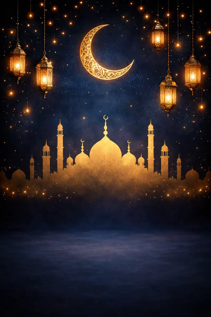 خلفية تصوير رمضانية بمسجد ذهبي متوهج مع هلال مزخرف وفوانيس معلقة ونجوم على سماء ليلية داكنة زرقاء، تصميم روحاني مهيب. خلفية تصوير احترافية بجودة عالية مطبوعة على مادة الفينيل المتين بدقة ألوان فائقة. مصممة خصيصاً للمصورين المحترفين الذين يبحثون عن تصاميم مميزة وعالية الجودة لاستوديوهاتهم.