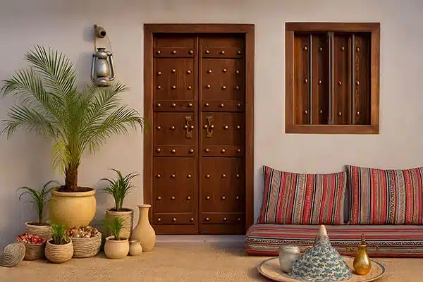 • استخدم إضاءة جانبية أو أمامية ناعمة لإبراز تفاصيل الخلفية التراثية والنقوش والألوان.