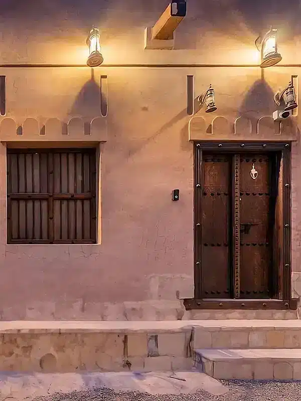 خلفية تراثية دقيقة بتصميم واجهة بيت نجدي بتفاصيل عالية مع باب خشبي وشباك واحد وفانوس جدار يوفر تركيزاً على التفاصيل المعمارية الدقيقة.