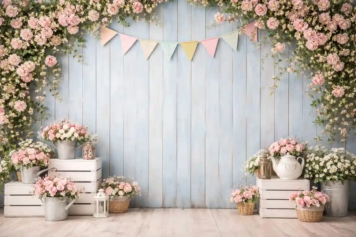 خلفية تصوير أطفال بجدار خشبي أزرق فاتح مع ورود وردية متسلقة وصناديق خشبية بيضاء وأباريق وفوانيس وأعلام ملونة، تصميم ربيعي بريء. مناسبة للتصوير الاحترافي داخل الاستوديو والتجارة الإلكترونية. خلفية أطفال احترافية تساعد على إبراز الأشخاص والمنتجات بشكل واضح وأنيق.