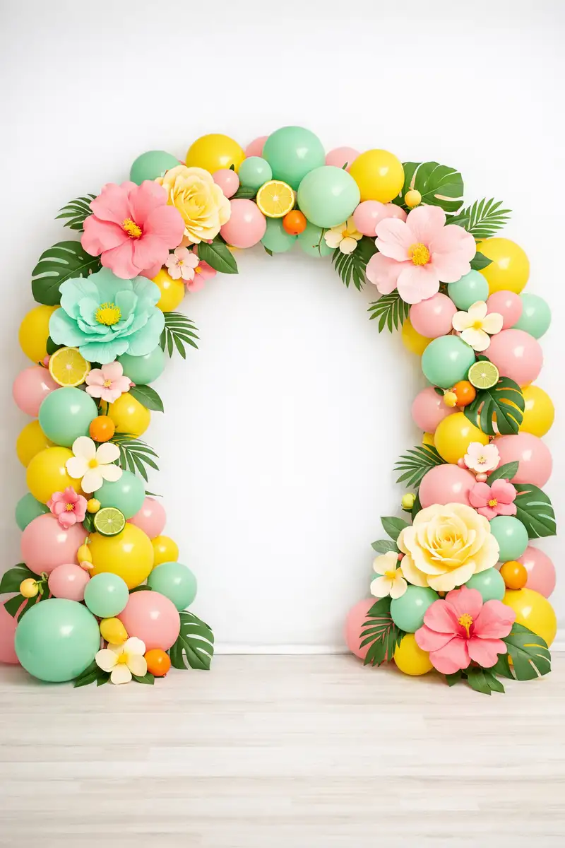 خلفية تصوير أطفال بقوس بالونات استوائية ملونة بالأخضر والأصفر والوردي مع زهور كبيرة وفواكه وأوراق نخيل على خلفية بيضاء، تصميم صيفي مرح. مناسبة للتصوير الاحترافي داخل الاستوديو والتجارة الإلكترونية. خلفية أطفال احترافية تساعد على إبراز الأشخاص والمنتجات بشكل واضح وأنيق.