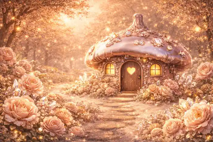 خلفية تصوير أطفال ببيت فطر ذهبي وردي مع ورود وكريستال في غابة ساحرة ذهبية اللون. مناسبة للتصوير الاحترافي داخل الاستوديو والتجارة الإلكترونية. خلفية أطفال احترافية تساعد على إبراز الأشخاص والمنتجات بشكل واضح وأنيق.