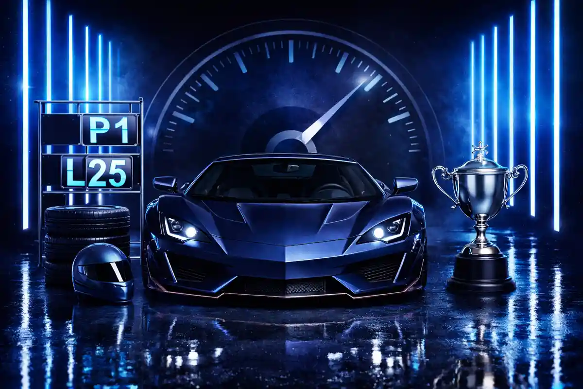 خلفية تصوير أطفال بسيارة سباق زرقاء مستقبلية مع نيون وكأس فضي وأعلام على خلفية سوداء. مناسبة للتصوير الاحترافي داخل الاستوديو والتجارة الإلكترونية. خلفية أطفال احترافية تساعد على إبراز الأشخاص والمنتجات بشكل واضح وأنيق.
