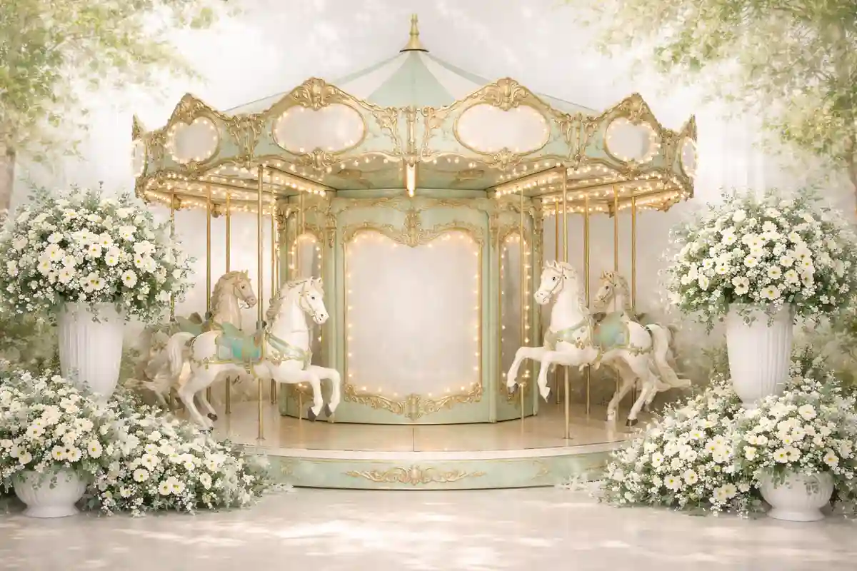 خلفية تصوير أطفال بتصميم كاروسيل أخضر نعناعي مع أقحوانات بيضاء وأجواء منعشة. مناسبة للتصوير الاحترافي داخل الاستوديو والتجارة الإلكترونية. خلفية أطفال احترافية تساعد على إبراز الأشخاص والمنتجات بشكل واضح وأنيق.