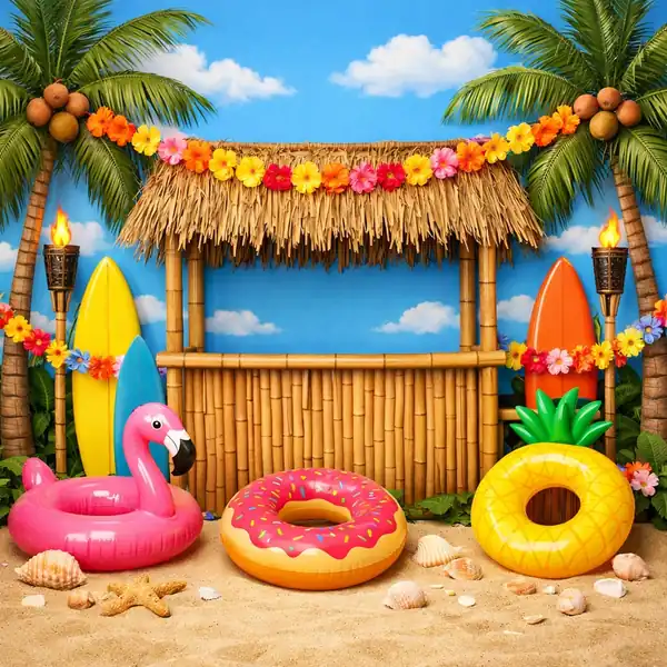 خلفية شاطئ هاواي الاحتفالية بعواميات ملونة فلامنجو وعجلة دونات وأناناس وألواح تزلج ملونة وكوخ بامبو وزينة الهيبيسكوس وأضواء شاطئية. مرح صيفي لا حدود له. توفر هذه الخلفية ألواناً زاهية وتفاصيل دقيقة تظهر بوضوح في الصور. سهولة التنظيف والتخزين تجعلها استثماراً ذكياً لأي استوديو.