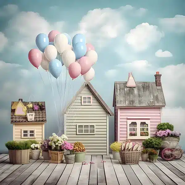 خلفية تصوير احتفالية – بيوت وبالونات ملونة