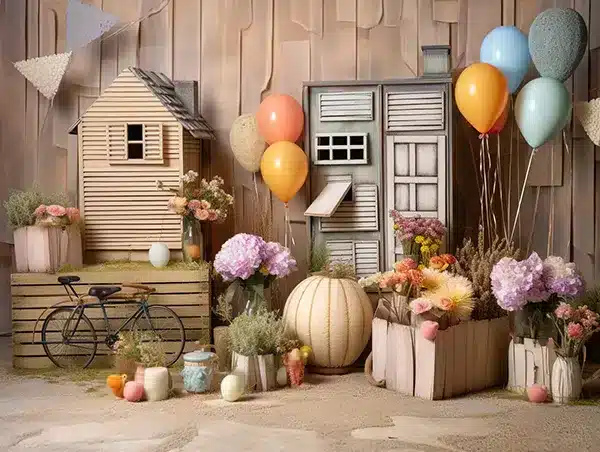 خلفية تصوير احتفالية – بيوت وبالونات ملونة