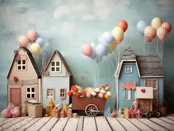 خلفية تصوير احتفالية – بيوت وبالونات ملونة