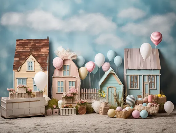 خلفية تصوير احتفالية - بيوت وبالونات ملونة