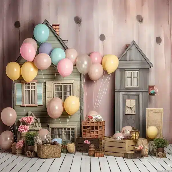 خلفية تصوير احتفالية – بيوت وبالونات ملونة