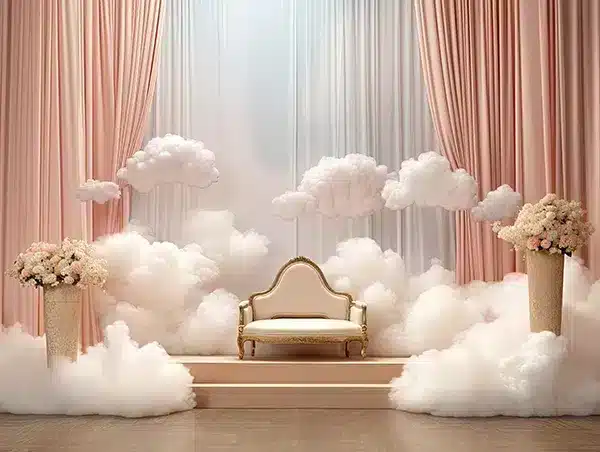 خلفية كلاسيكية فاخرة تجمع بين الستائر الوردية الناعمة والغيوم البيضاء الكثيفة، مع كرسي ذهبي أنيق على منصة مرتفعة، مثالية للجلسات العائلية والتصوير الاحترافي.