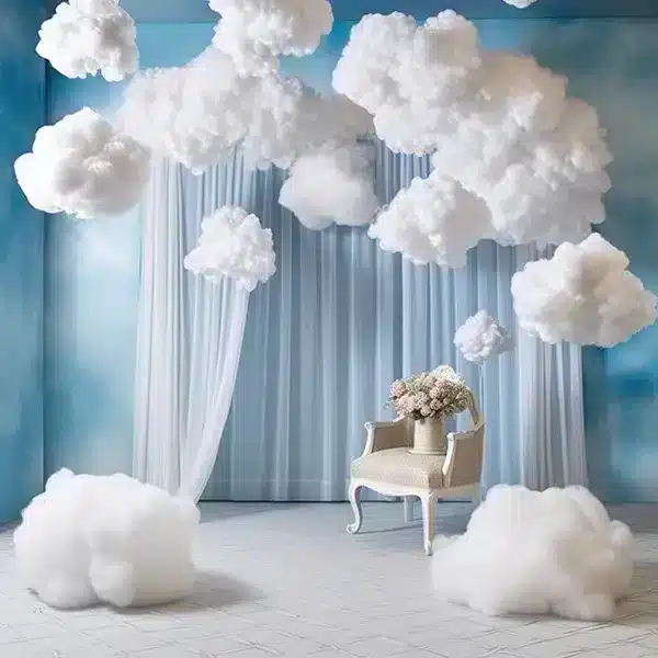 خلفية A-177 من Allmaie Studio تجسد الرومانسية والفخامة. مطبوعة على الفينيل ممتاز الجودة. ستائر زرقاء فاتحة وناعمة. غيوم بيضاء كثيفة حالمة وسحرية. كرسي كلاسيكي أنيق يجلس بفخامة. باقة ورود جميلة ملونة.