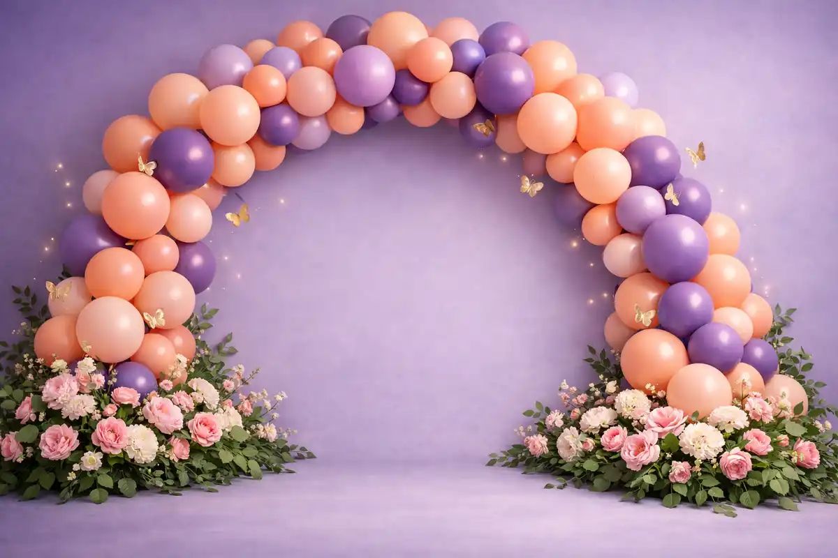 خلفية تصوير بقوس بالونات بنفسجية وبرتقالية مع فراشات ذهبية وزهور وردية على خلفية بنفسجية، تصميم احتفالي أنيق للمناسبات. خلفية تصوير احترافية بجودة عالية مطبوعة على مادة الفينيل المتين بدقة ألوان فائقة. مصممة خصيصاً للمصورين المحترفين الذين يبحثون عن تصاميم مميزة وعالية الجودة لاستوديوهاتهم.