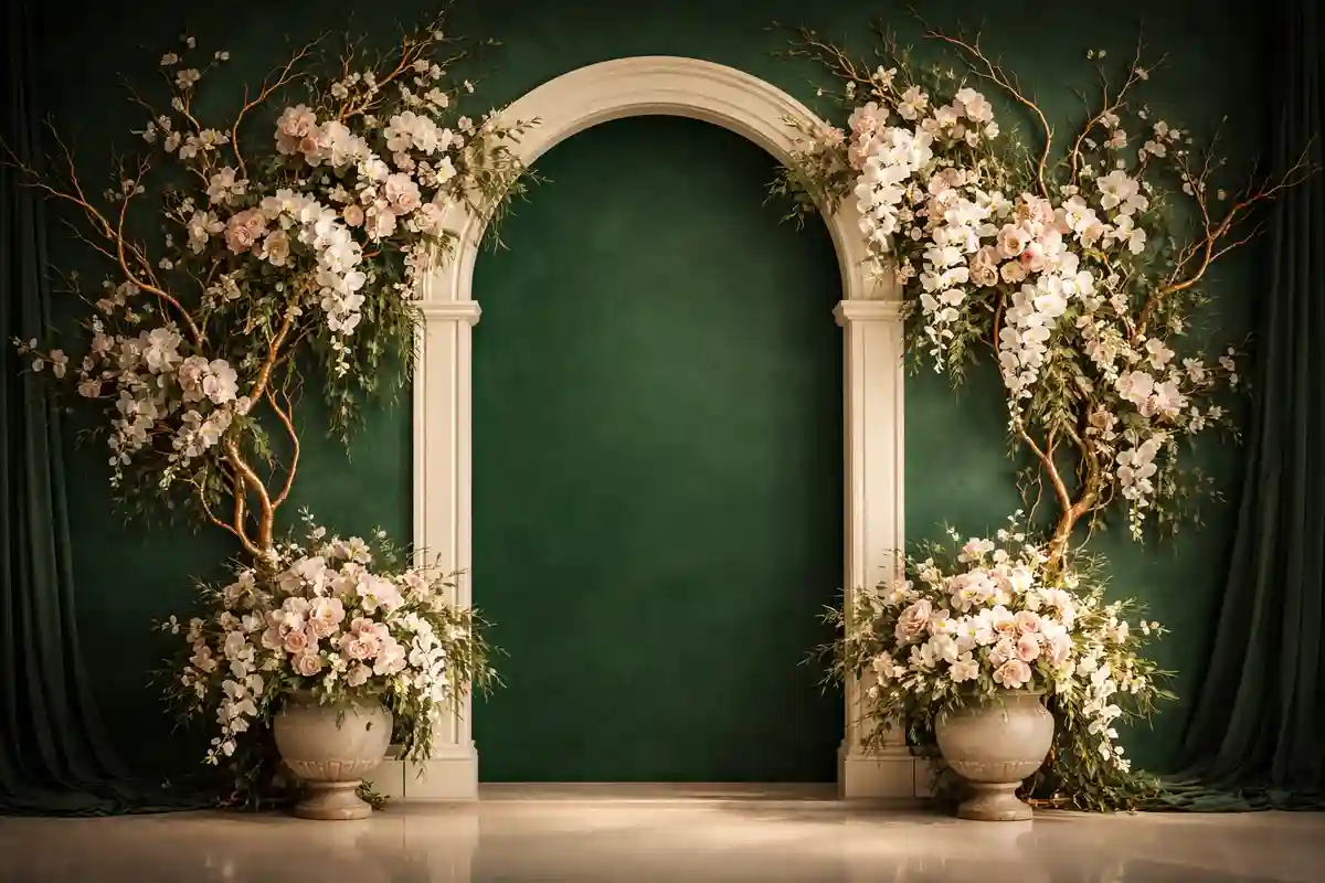 خلفية تصوير فاخرة بقوس رخامي أبيض على خلفية خضراء داكنة مع أشجار أوركيد بيضاء في مزهريات حجرية وأغصان ذهبية وستائر. مناسبة للتصوير الاحترافي داخل الاستوديو والتجارة الإلكترونية. خلفية كلاسيكية احترافية تساعد على إبراز الأشخاص والمنتجات بشكل واضح وأنيق.