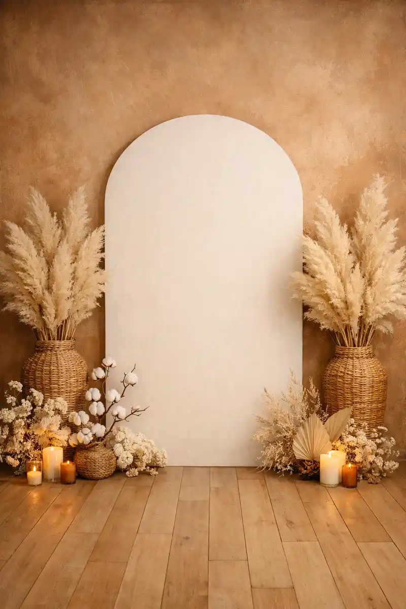 خلفية تصوير كلاسيكية بقوس بوهو مزين بأعشاب البامباس والشموع على أرضية خشبية دافئة، مثالية لتصوير البورتريه والمناسبات. مناسبة للتصوير الاحترافي داخل الاستوديو والتجارة الإلكترونية. خلفية كلاسيكية احترافية تساعد على إبراز الأشخاص والمنتجات بشكل واضح وأنيق.