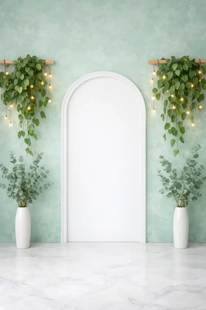 خلفية تصوير كلاسيكية بقوس أبيض على جدار أخضر نعناعي مع نباتات معلقة وإضاءة دافئة، تصميم عصري وأنيق. مناسبة للتصوير الاحترافي داخل الاستوديو والتجارة الإلكترونية. خلفية كلاسيكية احترافية تساعد على إبراز الأشخاص والمنتجات بشكل واضح وأنيق.