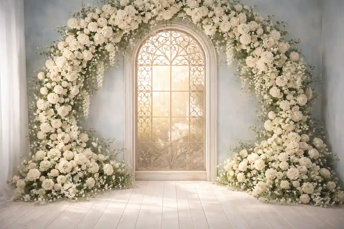 خلفية كلاسيكية فاخرة تتميز بقوس ورود بيضاء كثيفة وجميلة مع نافذة مقوسة مزخرفة وأرضية خشبية بيضاء. مثالية للتصوير الاحترافي والفعاليات الخاصة. متوفرة بـ 21 مقاس مختلف.