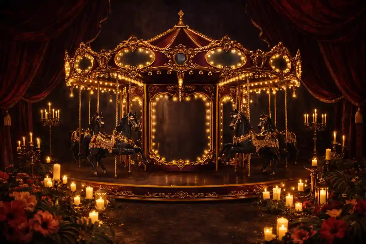 خلفية كلاسيكية بتصميم كاروسيل قوطي داكن مع شموع وستائر حمراء وأجواء درامية غامضة. مناسبة للتصوير الاحترافي داخل الاستوديو والتجارة الإلكترونية. خلفية كلاسيكية احترافية تساعد على إبراز الأشخاص والمنتجات بشكل واضح وأنيق.