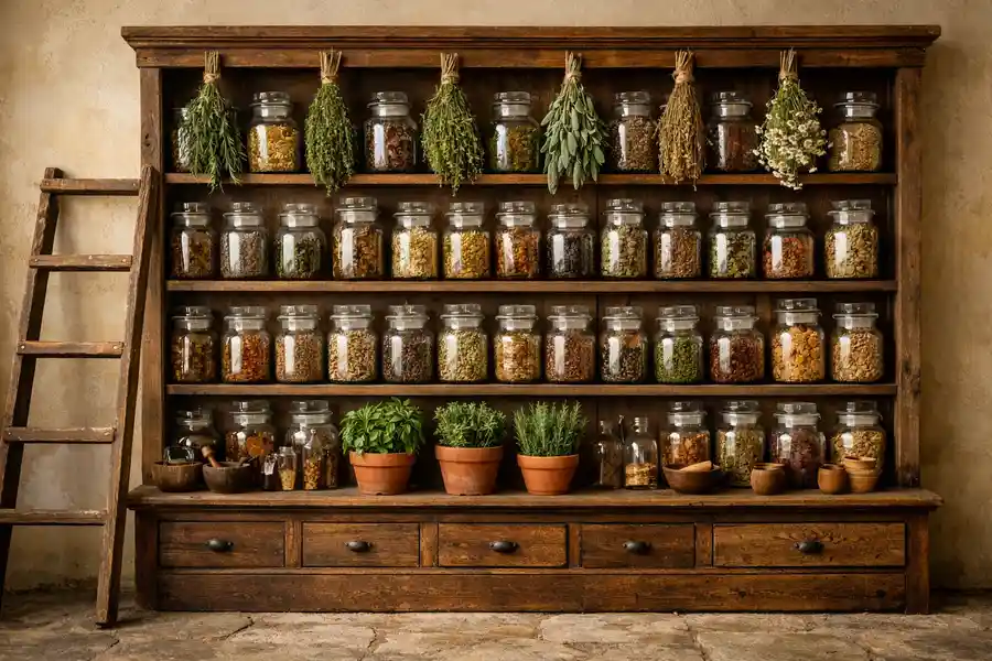 خلفية تصوير بخزانة خشبية عتيقة مليئة بالبرطمانات والأعشاب المجففة المعلقة بأجواء صيدلية قديمة. مناسبة للتصوير الاحترافي داخل الاستوديو والتجارة الإلكترونية. خلفية كلاسيكية احترافية تساعد على إبراز الأشخاص والمنتجات بشكل واضح وأنيق.
