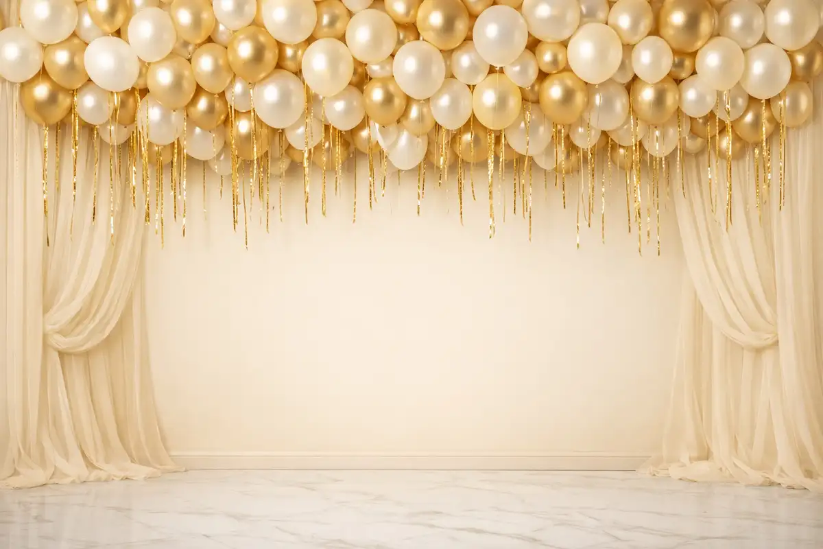 خلفية تصوير بسقف بالونات ذهبية وكريمية مع ستائر بيج وشرائط ذهبية لامعة. مناسبة للتصوير الاحترافي داخل الاستوديو والتجارة الإلكترونية. خلفية كلاسيكية احترافية تساعد على إبراز الأشخاص والمنتجات بشكل واضح وأنيق.