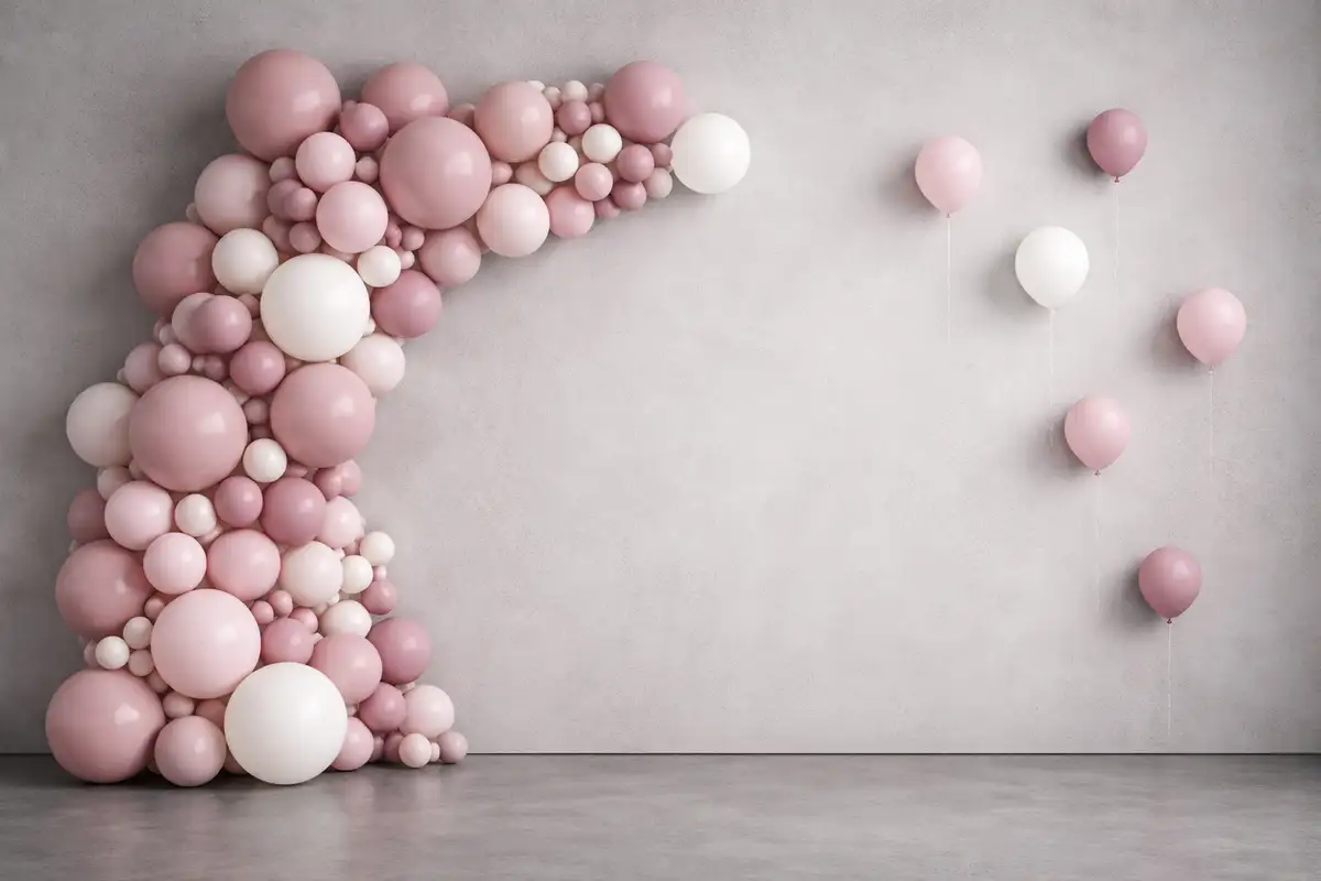 خلفية تصوير ببالونات وردية وبيضاء متجمعة على جانب جدار رمادي بتصميم عصري بسيط. مناسبة للتصوير الاحترافي داخل الاستوديو والتجارة الإلكترونية. خلفية كلاسيكية احترافية تساعد على إبراز الأشخاص والمنتجات بشكل واضح وأنيق.