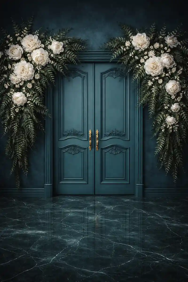 خلفية تصوير بباب كلاسيكي أزرق مخضر محاط بورود بيضاء وسرخس على أرضية رخامية داكنة. مناسبة للتصوير الاحترافي داخل الاستوديو والتجارة الإلكترونية. خلفية كلاسيكية احترافية تساعد على إبراز الأشخاص والمنتجات بشكل واضح وأنيق.