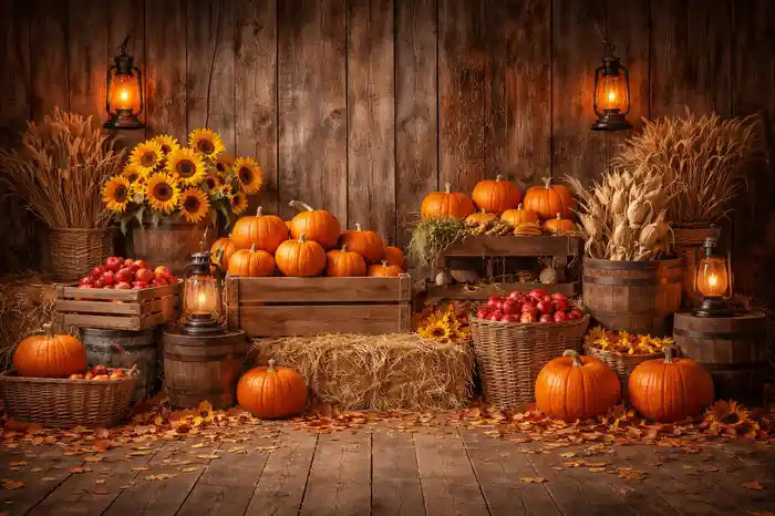 خلفية تصوير بأجواء خريفية دافئة مع يقطين وعباد شمس وتفاح وقش وفوانيس على خلفية خشبية. مناسبة للتصوير الاحترافي داخل الاستوديو والتجارة الإلكترونية. خلفية كلاسيكية احترافية تساعد على إبراز الأشخاص والمنتجات بشكل واضح وأنيق.