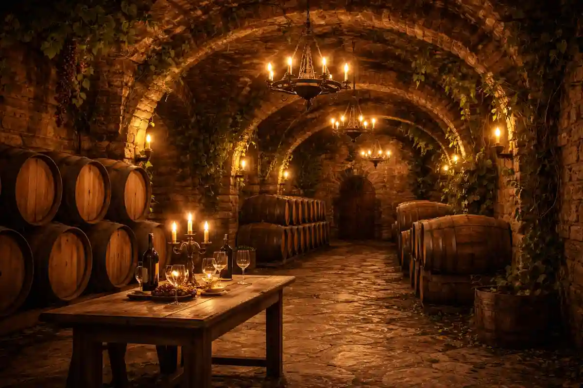 خلفية تصوير بقبو نبيذ حجري مقوس مع براميل خشبية وثريات وشموع وأجواء دافئة رومانسية. مناسبة للتصوير الاحترافي داخل الاستوديو والتجارة الإلكترونية. خلفية كلاسيكية احترافية تساعد على إبراز الأشخاص والمنتجات بشكل واضح وأنيق.