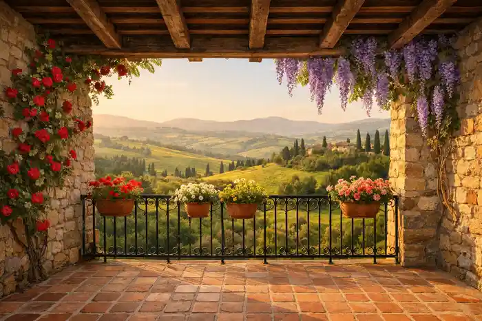خلفية تصوير بشرفة حجرية إيطالية مع سقف خشبي ووستيريا وورود حمراء وإطلالة على تلال خضراء. مناسبة للتصوير الاحترافي داخل الاستوديو والتجارة الإلكترونية. خلفية كلاسيكية احترافية تساعد على إبراز الأشخاص والمنتجات بشكل واضح وأنيق.