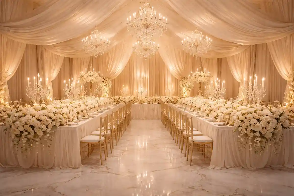 خلفية تصوير بقاعة زفاف فاخرة بيضاء وذهبية مع ثريات كريستال وورود وستائر حريرية. مناسبة للتصوير الاحترافي داخل الاستوديو والتجارة الإلكترونية. خلفية كلاسيكية احترافية تساعد على إبراز الأشخاص والمنتجات بشكل واضح وأنيق.