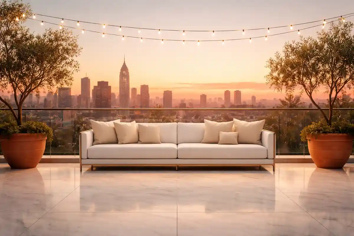 خلفية تصوير بتراس أنيق مع كنبة بيضاء وإطلالة على أفق المدينة وغروب برتقالي وأضواء معلقة. مناسبة للتصوير الاحترافي داخل الاستوديو والتجارة الإلكترونية. خلفية كلاسيكية احترافية تساعد على إبراز الأشخاص والمنتجات بشكل واضح وأنيق.