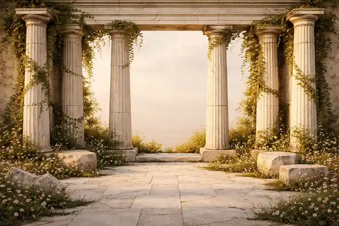 خلفية تصوير بأعمدة رومانية كلاسيكية مع أزهار برية ولبلاب أخضر متسلق وإضاءة ذهبية. مناسبة للتصوير الاحترافي داخل الاستوديو والتجارة الإلكترونية. خلفية كلاسيكية احترافية تساعد على إبراز الأشخاص والمنتجات بشكل واضح وأنيق.