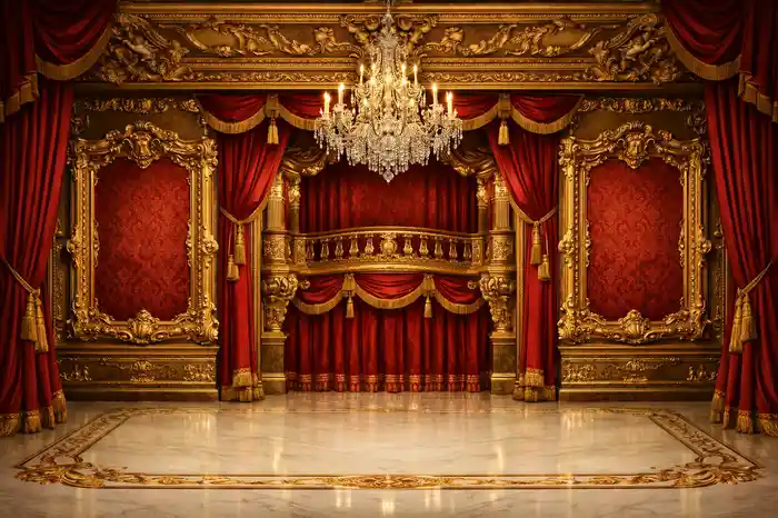 خلفية تصوير بقاعة مسرح ملكية فاخرة بستائر حمراء مخملية وإطارات ذهبية وثريا كريستال. خلفية تصوير احترافية بجودة عالية مطبوعة على مادة الفينيل المتين بدقة ألوان فائقة. مصممة خصيصاً للمصورين المحترفين الذين يبحثون عن تصاميم مميزة وعالية الجودة لاستوديوهاتهم.