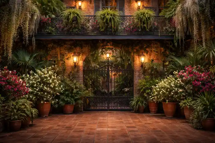 خلفية كلاسيكية بتصميم فناء استعماري أنيق مع بوابة حديدية مزخرفة ونباتات خضراء متسلقة وأصص فخارية وفوانيس جدارية دافئة وبلاط تيراكوتا. مثالية لتصوير الأزياء والبورتريه والمناسبات الراقية.. مناسبة للتصوير الاحترافي داخل الاستوديو والتجارة الإلكترونية. خلفية كلاسيكية احترافية تساعد على إبراز الأشخاص والمنتجات بشكل واضح وأنيق.