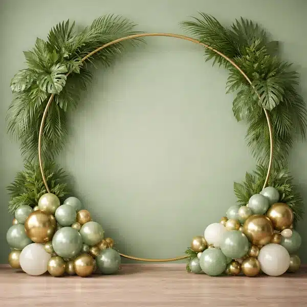 خلفية قوس دائري ذهبي مزين بأوراق نباتات استوائية خضراء طازجة وبالونات بيج وذهبية وخضراء أنيقة. تصميم عصري يجمع الطبيعة مع الأناقة الذهبية. توفر هذه الخلفية ألواناً زاهية وتفاصيل دقيقة تظهر بوضوح في الصور. سهولة التنظيف والتخزين تجعلها استثماراً ذكياً لأي استوديو.