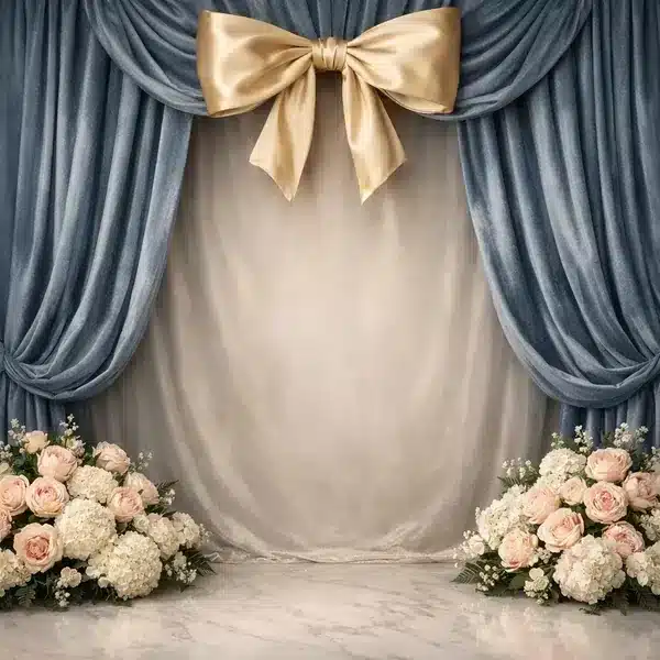 خلفية ستائر مخمل أزرق فاخر مفتوحة بريبون ساتان ذهبي كبير مع باقات ورد وردي وأبيض رقيق على أرضية رخامية. تناسق لوني ساحر بين الأزرق والذهبي. توفر هذه الخلفية ألواناً زاهية وتفاصيل دقيقة تظهر بوضوح في الصور. سهولة التنظيف والتخزين تجعلها استثماراً ذكياً لأي استوديو.