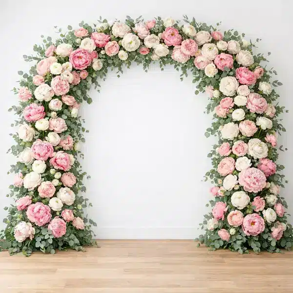 خلفية قوس من زهور الفاوانيا الوردية والبيضاء الغنية مع أوراق الإيكاليبتوس الخضراء على جدار أبيض ناصع. تصميم ربيعي مبهج يفيض بجمال الورد. توفر هذه الخلفية ألواناً زاهية وتفاصيل دقيقة تظهر بوضوح في الصور. سهولة التنظيف والتخزين تجعلها استثماراً ذكياً لأي استوديو.