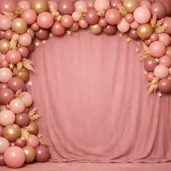 خلفية قوس بالونات دافئة بألوان الوردي والبيج والذهبي الروز مع نباتات بامباس جافة ونجوم ذهبية صغيرة على ستارة وردية ناعمة. تصميم بوهو شيك دافئ. توفر هذه الخلفية ألواناً زاهية وتفاصيل دقيقة تظهر بوضوح في الصور. سهولة التنظيف والتخزين تجعلها استثماراً ذكياً لأي استوديو.
