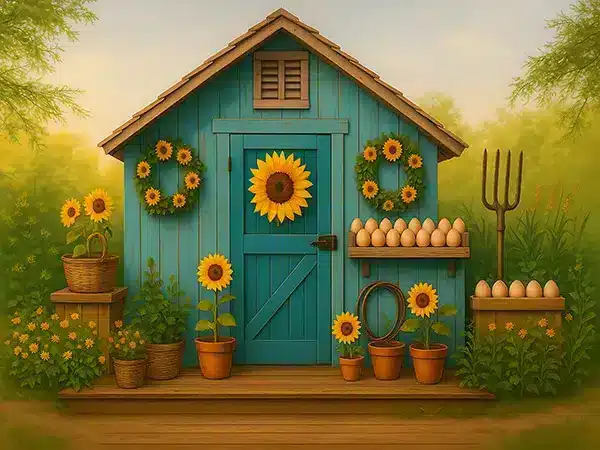 خلفية تصوير A-92 توفر جواً ريفياً ودافئاً يجسد سحر الحياة الريفية والزراعة التقليدية. الحظيرة الزرقاء القديمة توفر سياقاً معمارياً قوياً مع الخشب الخام والألوان الأثيرة. عباد الشمس الصفراء الزاهية تضيف حياة وفرح للمشهد الريفي. الإكسسوارات مثل البيض والأدوات الزراعية والشوكة والحبال توفر تفاصيل حقيقية وأصيلة. مادة الفينيل عالية الجودة تحافظ على الألوان الدافئة والطبيعية لفترات طويلة، والفينيل المختار يعطي نعومة طبيعية بدون لمعان زائد.